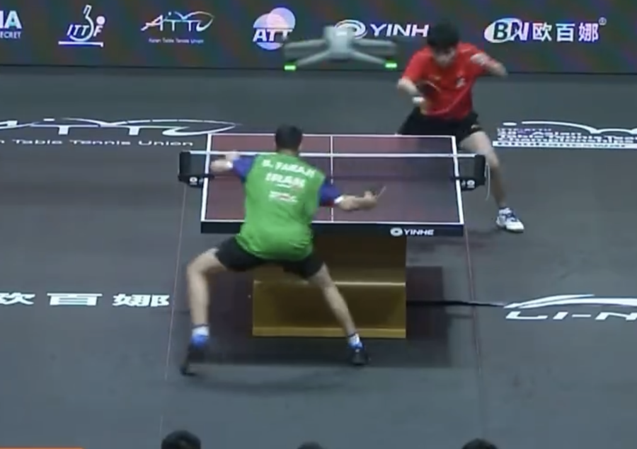 场馆硬件设施的“潦草”也成为槽点。比赛前夕,地胶还没有铺设完全。训练场有小青蛙作为“陪练”,训练时更出现过鸟粪掉落的尴尬场景。比赛中则发生过屋顶漏水状况,工作人员不得不在运动员擦汗间隙频繁进场拖地。在林诗栋与伊朗小孩哥法拉吉的比赛中,甚至有无人机闯入直播镜头,在球员头顶“低空”飞行。