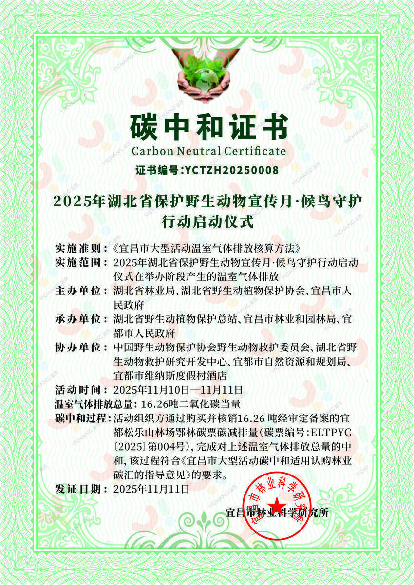 本次活动碳排放核算依据今年6月印发的《宜昌市大型活动碳中和适用认购林业碳汇的指导意见》,涵盖交通、住宿、餐饮、耗材、废弃物、化石燃料和用电等关键环节,核算边界明确,将活动举办阶段产生的温室气体排放全部纳入,最终通过科学测算得出16.26吨碳排放总量。活动结束后,组织方通过宜昌两山转化运营中心线上平台完成碳减排量认购,并取得碳中和证书。